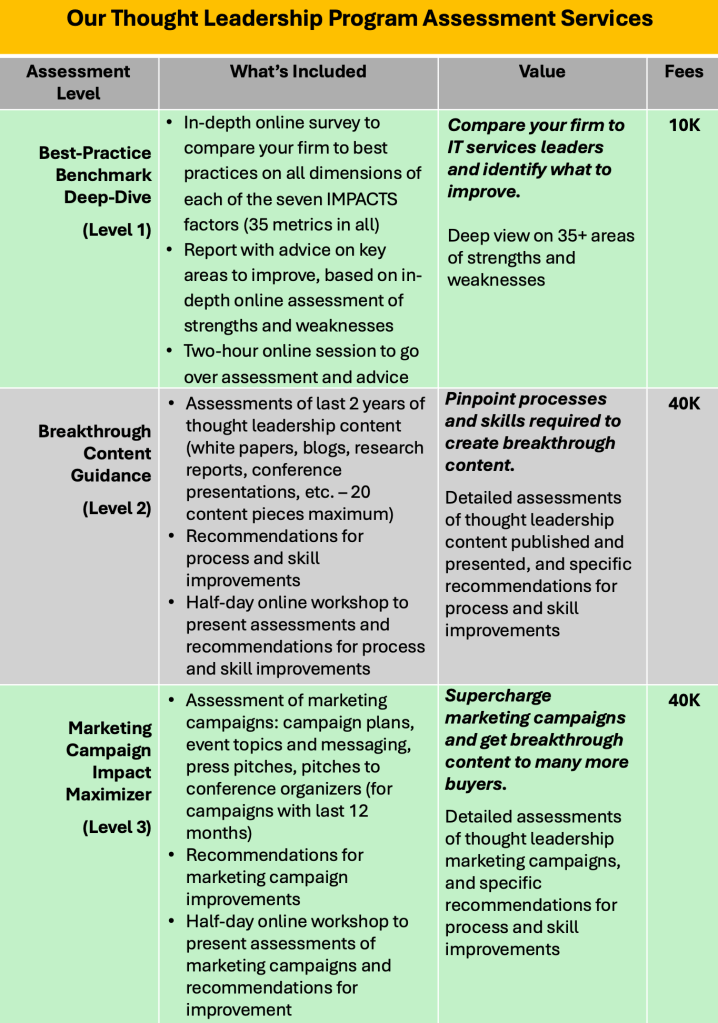 We help companies assess the strengths and weaknesses of their thought leadership programs. Using this research on best practices in thought leadership, we provide three levels of assessment and advice to help IT services firms raise their thought leadership game. (See table below.)