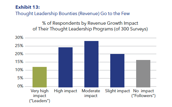 To quickly identify these two subsets of our survey participants, we’ll refer to those that said thought leadership had very high impact (36 surveys, or 12% of the 300-participant survey base) as “Leaders.” And we’ll call those who said no impact (47 respondents, or 16% of the base) as “Followers.” (See Exhibit 13.)