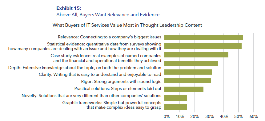 From two questions that we asked, the 200 executives in 11 industries that choose IT services firms indicate a strong preference for extensive best-practice research. One question was about the qualities of thought leadership content they valued. We gave them a list of nine and asked them to list the three they valued most. (See Exhibit 15.) The three most frequently mentioned were: