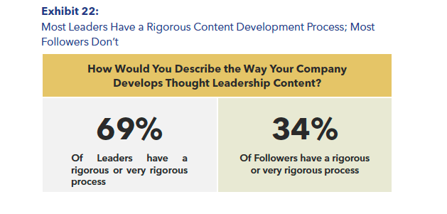 This is a major difference between the best IT services firms at thought leadership (the Leaders) and the rest. Nearly 70% of Leaders had a rigorous or very rigorous process. That was more than twice the number of Followers (34%). (See Exhibit 22.)