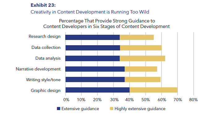 In each of those six stages, on average only a minority (30% or fewer) of IT services firms give content developers highly extensive guidance. (See Exhibit 23.) But the picture looks better when you combine survey respondents who said “extensive” guidance with those who said “highly extensive” guidance.
