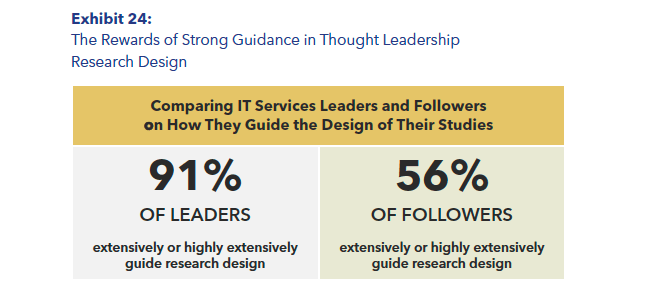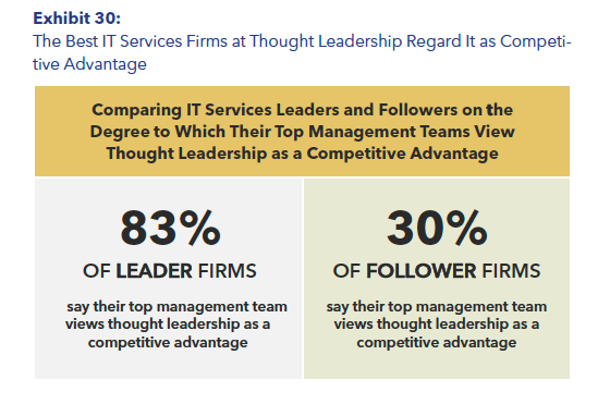 Now let’s deeply explore what IT services “Leaders” and “Followers” at thought leadership do differently. We’ll also present how they compare to the average for all 300 IT services firms surveyed.