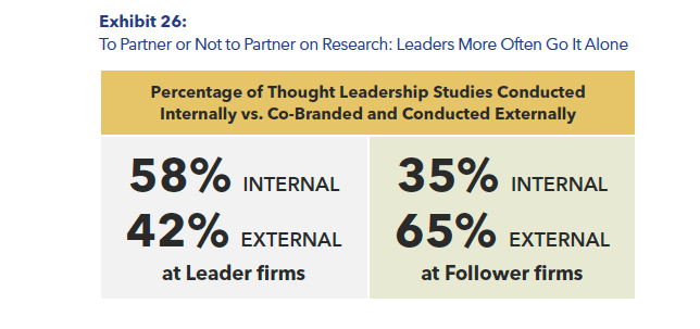 Perhaps because many are less experienced at conducting thought leadership primary research, the Followers were far more likely to work with research or publishing companies on studies. We asked what percentage of their studies were co-branded with and conducted by research, analyst firms, and publishers.
