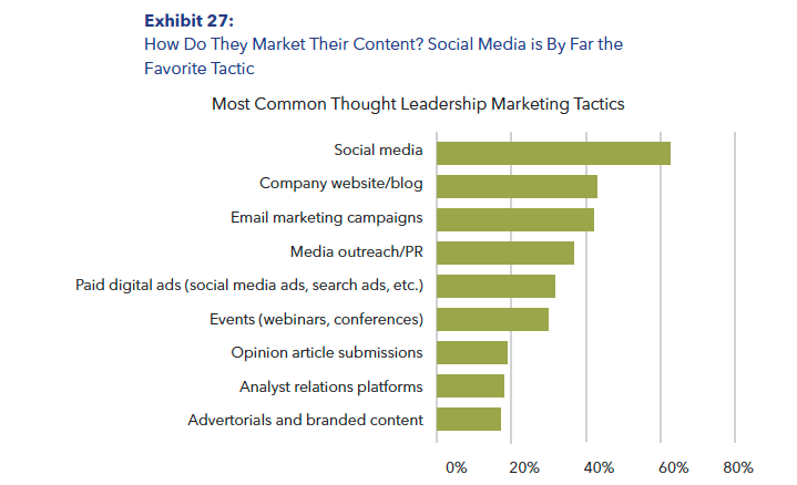 First, let’s look at their thought leadership marketing tactics. In frequency of usage of nine tactics, the most popular by far is social media channels (by 63%). A distant second and third are their company’s website (43%) and email marketing (42%). Much lower on the list: op-eds (19%) and advertorials (17%). (See Exhibit 27.)