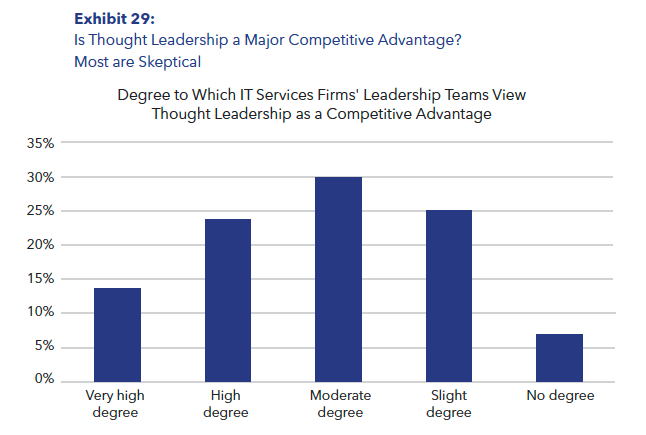 A last note about thought leadership research: The IT analyst firms have long promoted their services in conducting co-branded thought leadership research for their clients, which of course include IT services firms. But with co-branding comes an intellectual capital issue. Are the insights truly from your company? Or are they from the analyst firm that conducted the study with or for you? We believe your audience will figure it’s the analyst firm, particularly because their business is conducting research.