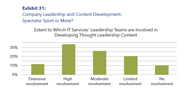 Answers to another survey question further suggest that Leaders are more intentional about how they allocate their investments. When asked about their leadership team’s involvement in content development, 86% of Leaders characterized it as “highly” involved or playing a “critical role” (meaning, they drive topic strategy and other aspects of thought leadership). In contrast, only 11% of Followers said the same thing; 60% of these IT services firms said their leadership team was not involved at all or had only limited involvement.