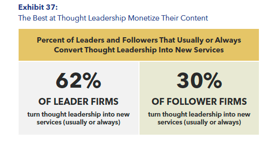 The best IT services firms at thought leadership – our so-called Leaders – are twice as likely to turn thought leadership into service offerings than the Followers. Some 62% of Leaders say they do it vs. 30% of Followers. (Exhibit 37.)