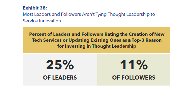 - Followers invest 71% less on thought leadership content development and marketing than the average IT services firm: (0.5% vs. 1.75% of revenue).