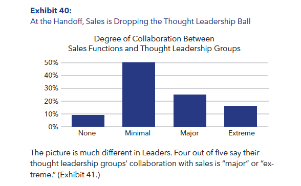 The picture is much different in Leaders. Four out of five say their thought leadership groups’ collaboration with sales is “major” or “extreme.” (See Exhibit 41.)