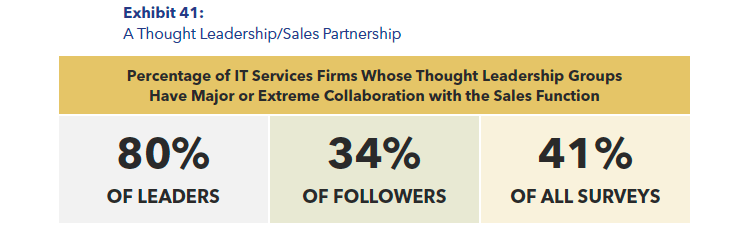 That is a warning sign for the 59% of thought leadership groups that do great work but are shunned or given short shrift by their firm’s sales force. In a world of increasing competition among tech services firms, and mounting customer confusion about how to solve their problems and which IT services can best do it, salespeople need thought leadership at the point of sale more than ever. “The Challenger Sale” book established that in the last decade. A new book, “The Framemaking Sale,” makes an even tighter connection between thought leadership and business development.[vii]