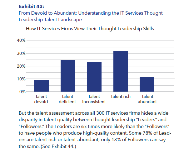 But the talent assessment across all 300 IT services firms hides a wide disparity in talent quality between thought leadership “Leaders” and “Followers.” The Leaders are six times more likely than the “Followers” to have people who produce high-quality content. Some 78% of Leaders are talent-rich or talent-abundant; only 13% of Followers can say the same. (See Exhibit 44.)