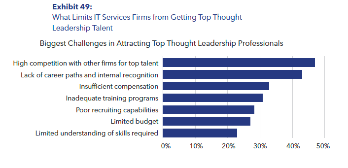 The most frequently cited hiring challenge: high competition with other firms for top talent (meaning, in part, that compensation may be a hurdle). Nearly half (47%) cited this. The second was lack of career paths and internal recognition for thought leadership roles. Some 43% chose that. (See Exhibit 49.)