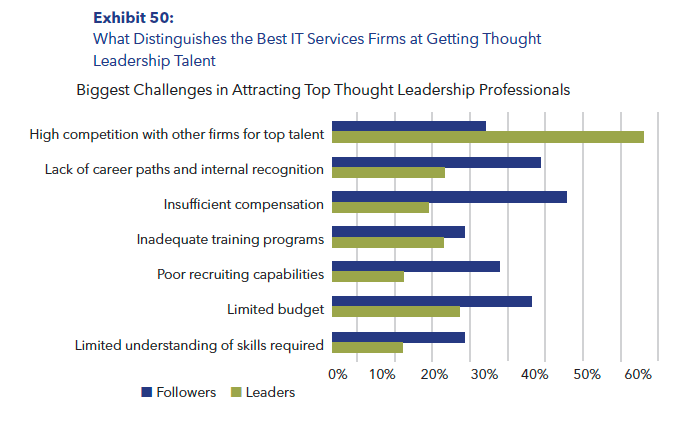 The best IT services firms at thought leadership better understand the skills they need, which also makes them better at evaluating people who knock on their doors. It’s why, we believe, only 14% of Leaders said “limited understanding of skills required” was a challenge, and only 14% said they had poor recruiting capabilities. (Some 33% of Followers said their recruiting capabilities for thought leadership talent was poor.) (See Exhibit 50.)