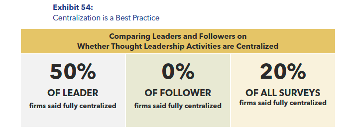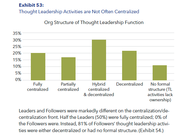 Leaders and Followers were markedly different on the centralization/decentralization front. Half the Leaders (50%) were fully centralized; 0% of the Followers were. Instead, 81% of Followers’ thought leadership activities were either decentralized or had no formal structure. (Exhibit 54.)