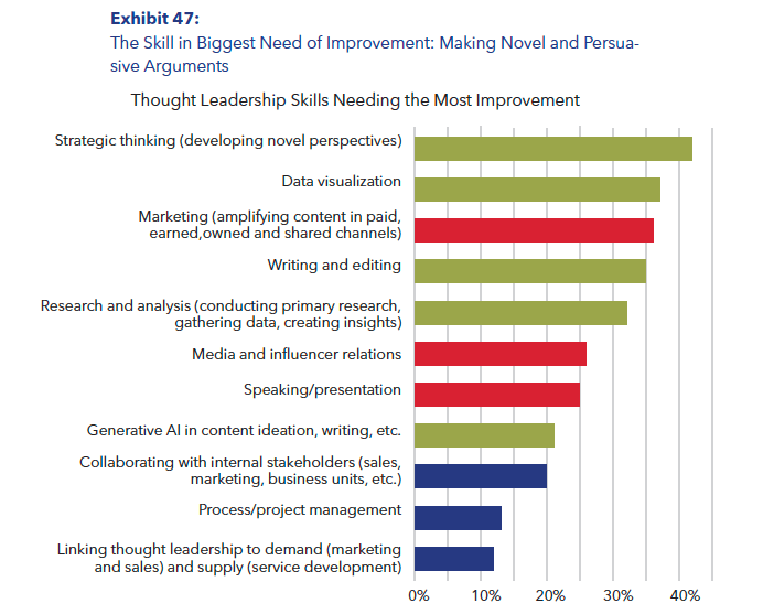After asking them which three skills were most critical to thought leadership, we then asked which three of those same 11 skills they needed to improve the most. They cited five most often, four of which are content development skills and one a marketing skill. (See Exhibit 47.)