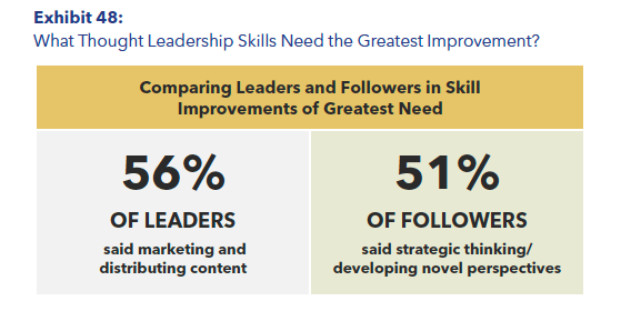 We found little variance between “Leaders” and “Followers” in what they see as their three most critical thought leadership skills. Only two skills showed some difference (more than 10 percentage points):