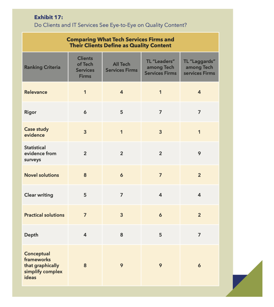 We’ve heard this question since the late 1980s: What constitutes outstanding thought leadership content? If you knew exactly what drives clients from reading to reaching out, you’d work hard to make sure your studies, white papers, conference presentations, books, and blog posts reflected those attributes. For example, what makes a “big” idea big?
